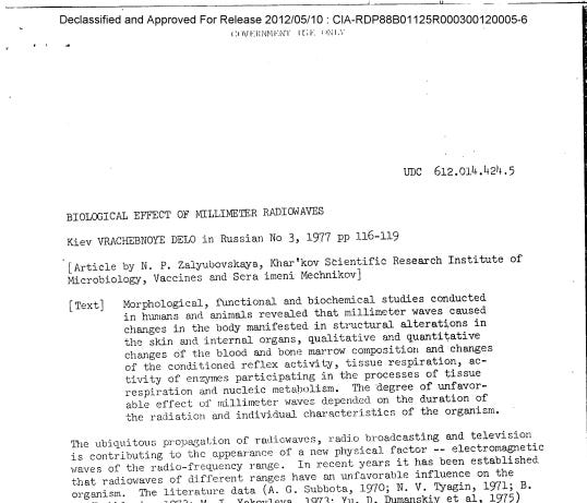 L'année suivante, la CIA traduisit et diffusa une étude soviétique de N.P. Zalyubovskaya portant sur les effets biologiques des rayonnements millimétriques. Cette étude exposait des souris à des fréquences comprises entre 37 et 60 GHz, à raison de 1 milliwatt par centimètre carré, pendant 15 minutes par jour pendant 60 jours, et comparait les résultats avec ceux obtenus chez des humains exposés professionnellement à des générateurs d'ondes millimétriques. Le tableau clinique correspondait à celui que Glaser avait déjà répertorié à partir de recherches soviétiques antérieures sur l'exposition professionnelle : une confirmation indépendante de la même origine biologique. Deux axes de recherche distincts aboutissant au même résultat clinique.