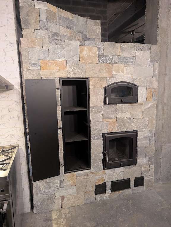 Établi au Québec depuis 2000, et entrepreneur en maçonnerie depuis 2005, il s’efforce de rendre les foyers de masse accessibles. Pour réduire leur coût d’au moins 20 000 $, la plupart de ses clients optent pour un cœur de foyer préfabriqué, plus performant que les foyers de masse plusieurs fois centenaires sur lesquels il a été modélisé. « Un kit très efficace coûte 17, 18 000 $ et on le recouvre de 5 po de pierre pour doubler la masse : un bloc de ciment de 3,5 po dont je remplis les trous de petit gravier, pour accumuler la chaleur, et 1,5 po de pierre naturelle collée sur le bloc de béton, pour la diffuser. Cette pierre donne un rayonnement beaucoup plus intéressant. »